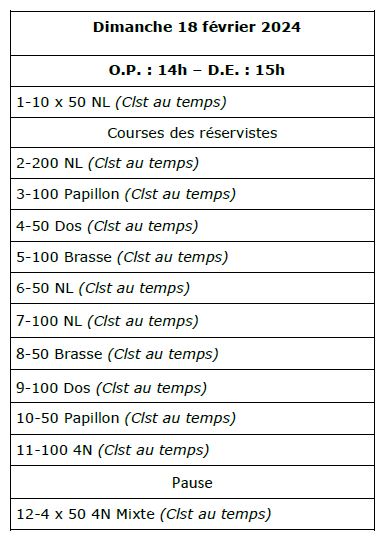 • Épreuves de relais : 4 x 50 4N Mixte (obligatoirement 2 dames et 2 messieurs) - 10 x 50m NL ( composé des 10 nageurs
